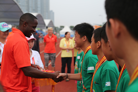 跳远世界冠军德怀特·菲利普斯为季军队颁奖