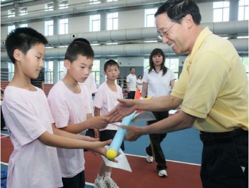 其实在接洽之前,国际田联也在中国推广过,当时捐赠了两套器材。当时国际田联主要推理念,团队性的跑跳走投全面参与,游戏性很强,因为器材投入比较大,所以后来想没有器材是不是也可以进行,而且器材也可以自制,所以主要推行的是这种全新的理念。当时学校用的非常好,孩子们也很喜欢,但是这两套设备是给学校轮着用,所以当这套器材没有了之后,学校也就逐渐不再开展这个运动了。这是为什么?就是体育器材的原因。对于学校体育来说,一定的器材体现一定的理念,体育器材就是理念的载体,没有这些器材的话,教师即使有再好的想法也难以实施。田联阳光的介入完全打破了这一窘况,我们有工厂、研发人员、而且和很多器材厂商有很好的合作,完全可以解决器材不到位的情况。而且国际田联属于田径,学校体育有属于教育,这是一个跨部门的合作,中间会产生许多分歧,所以通过田联阳光在中间可以解决这些问题。最后国际田联指派专家和我们国家的专家一起研发体育器材,再经过国际田联的检测验收,正式完成。这意味着“少儿趣味田径”在我国的推广进入了一个全新的局面。在2009年9月5日国际田径日,我们首次推出这套器材,为北京的30所学校捐赠了这套器材,之后进入全国的推广发行。