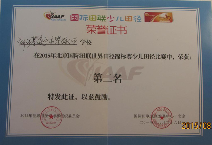 经过决赛的紧张、激烈的拼搏,在6个单项中,以3个第一,1个第三,2个第四,总分34分获得本次比赛团体总分第二名,(第一名:深圳荔园小学35分)。圆了紫微田径人的梦想,赛后,国际田联少儿田径推广部主任埃利斯为获奖小选手颁奖并合影。