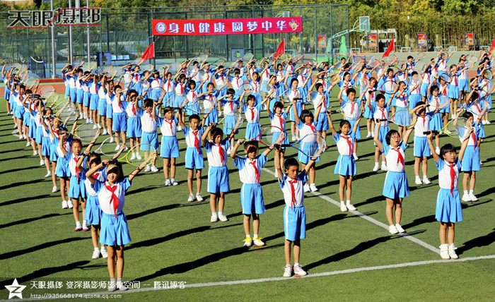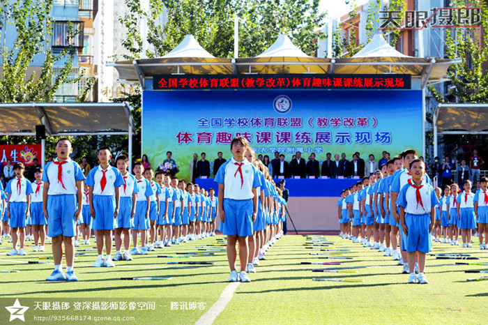 北京农学院附属小学操场上,900多名孩子快乐的表演着数百种体育课项目, 孩子们整齐划一的表演迎来现场嘉宾和观众们的阵阵掌声。