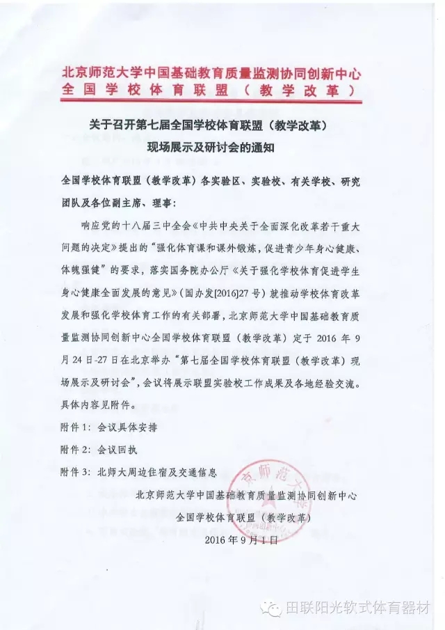 2016年9月23日-9月27日期间,“第二届中国教育创新成果公益博览会”和“北京市第七届全国学校体育联盟(教学改革)现场展示及研讨会”将先后于北京师范大学举办,国际田联少儿趣味田径项目作为“高参小”重点推广项目及“一校一品”体育特色将于活动现场举行集中展示及体验活动。